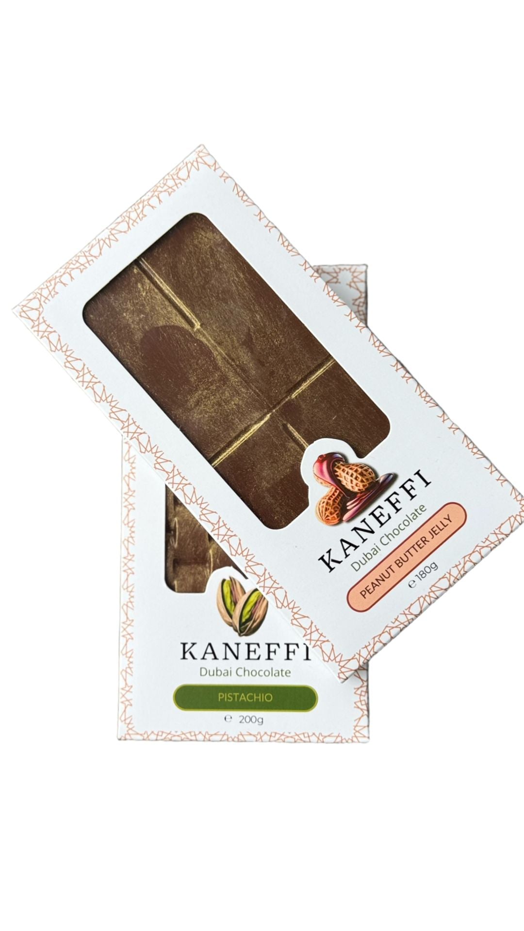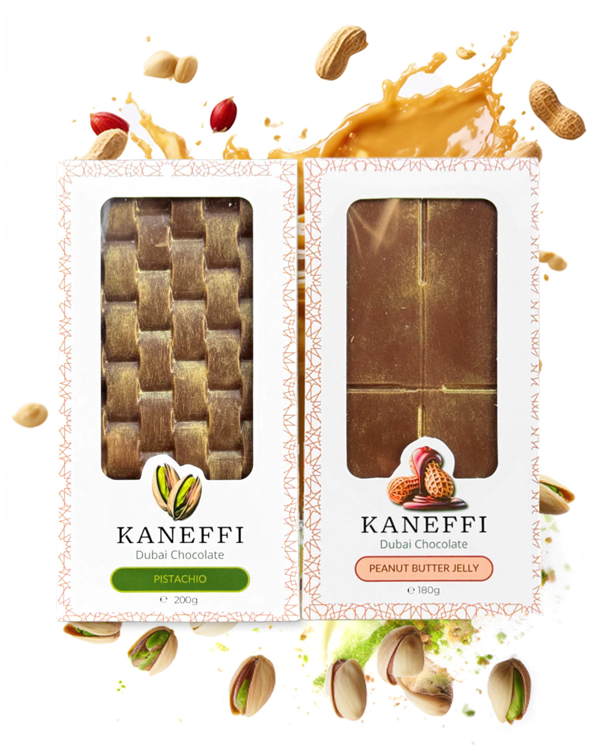 Our irresistible Peanut Butter Jelly Dubai Chocolate, gooey, sweet , salty perfection… and the OG Pistachio Dubai Chocolate, creamy, nutty, melt in your mouth magic.